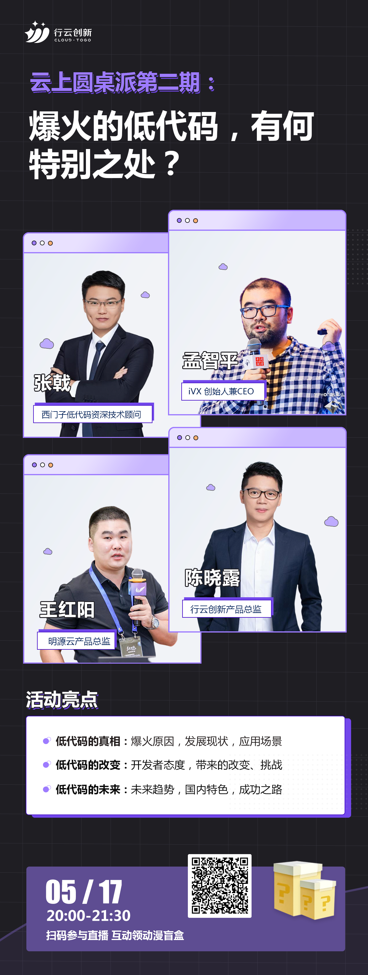 5月17日20:00《云上圆桌派第二期:爆火的低代码,有何特别之处》直播来啦!活动邀请西门子工业软件西门子低代码资深技术顾问张戟,iVX 创始人兼CEO孟智平,明源云产品总监王红阳,星空游戏创新产品总监陈晓露四位大咖和星空游戏创新CEO马洪喜一起对低代码爆火背后的原因、开发者对低代码的态度、低代码带来的变化和应用场景等多个话题展开讨论。